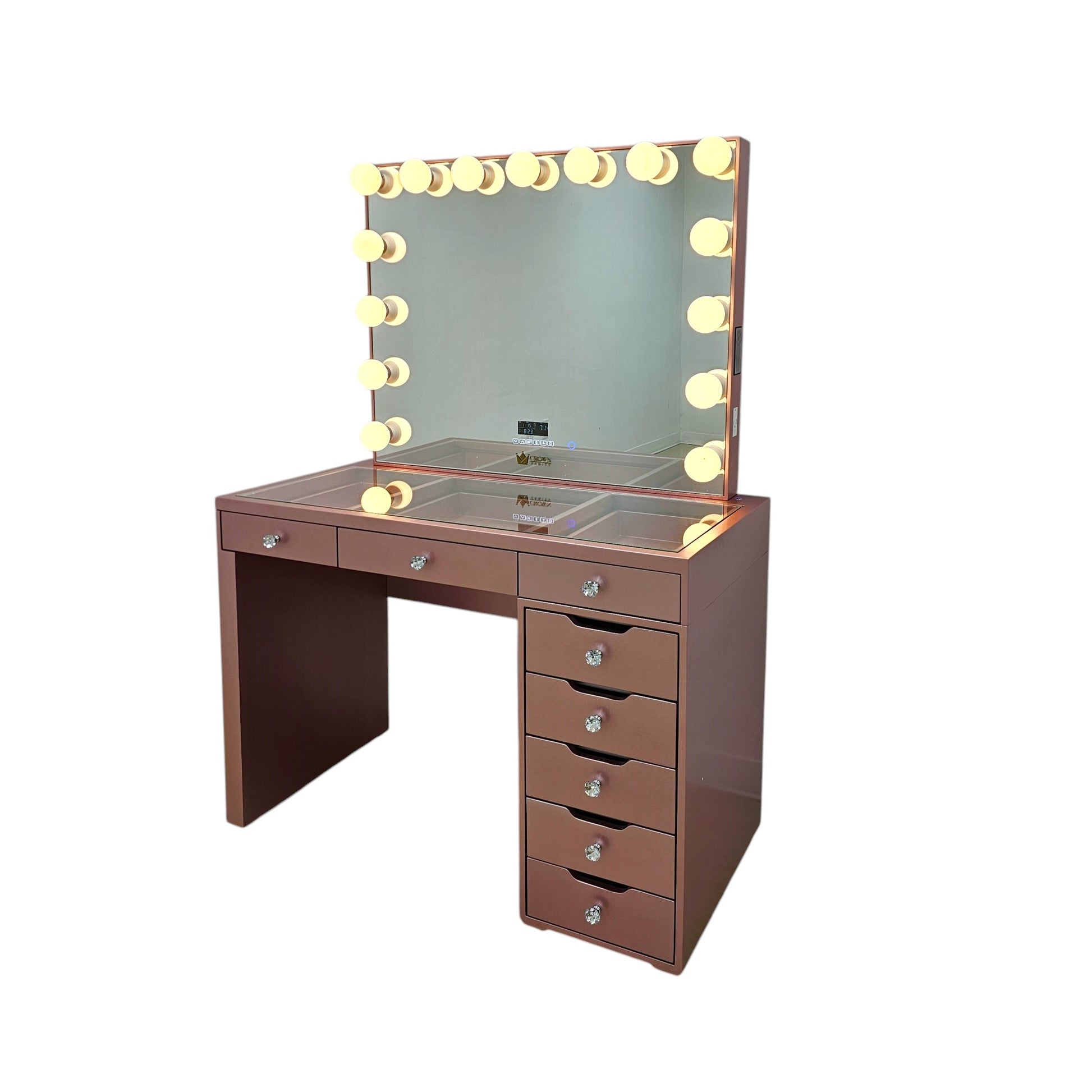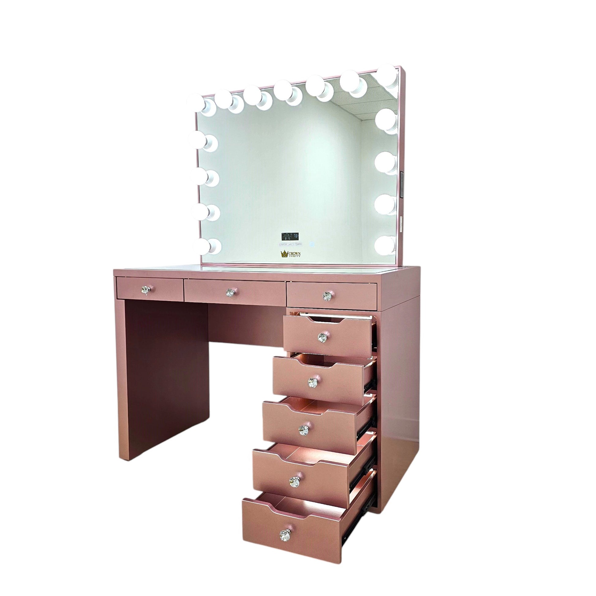 Look for spacious storage, durable materials, and exceptional lighting. Crown Vanity delivers all that and more, with features like light-up drawers, crystal-clear mirrors, and integrated outlets for your devices. Every detail is crafted for beauty and functionality.